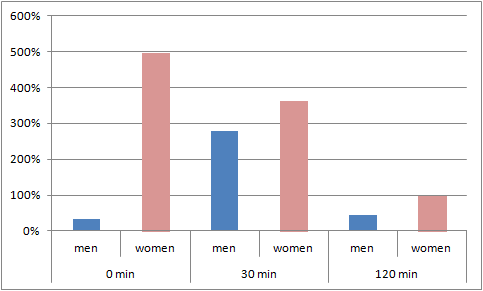 | Figure 2: Fat oxidation (in kcal/kg per min) calculated based on respiratory exchange ratio in male and female participants of a 90min cycling bout at 60% of their individual VO2Max (Roepstorff. 2006) |